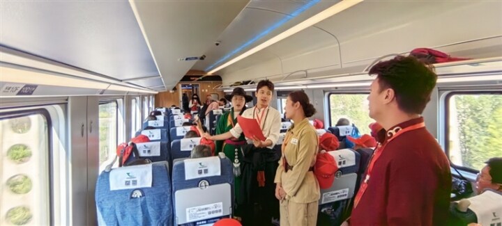 紅色專列疾馳向海晏縣,窗外景色遼闊壯美,車廂內紅色氛圍濃厚。大家高唱《在那遙遠的地方》《我和我的祖國》等經典歌曲。車廂中同樣也化作了流動的紅色課堂,一段段塵封的紅色故事在談笑間蘇醒,退伍軍人們談感受體會,回憶崢嶸歲月,歌聲與歡笑交織,現場氣氛熱烈。紅色專列載著滾燙的軍心,向著那片熱血的紅色沃土進發。