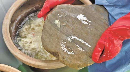 10時,處理好的蔬菜被分批裝入陶缸。每鋪一層,都要均勻撒上鹽,反復揉搓使鹽分滲透。之后壓上平整厚實的青石,再用塑料布密封缸口,隔絕空氣,最后交給時間慢慢發酵。