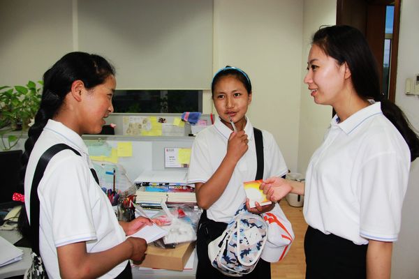 圖為結(jié)措(左)、仁青措毛在和求是雜志社的老師交流   本網(wǎng)記者 劉志強(qiáng)攝