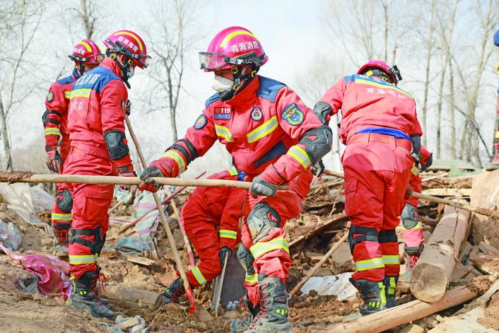 12月20日,西寧市消防救援人員在民和縣中川鄉草灘村救援現場搜尋失聯人員。師澤林 攝