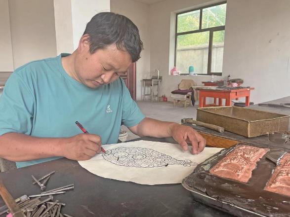走進龍知布的工作室,約80平方米的屋內,龍知布俯身埋頭,緊握鏨刀雕花,他每撬動一下鏨子、每敲下一錘,都非常專注。旁邊的桌子上放著事先設計好的圖稿,上面是各種已經畫好的圖案,在敲制成器形的銅表面鏨刻花形,使其成為層次分明的立體浮雕銅器鏨刻作品。