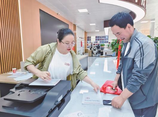 青山鄉(xiāng)人民政府工作人員在為村民張全德辦理領(lǐng)取房屋鑰匙手續(xù)。