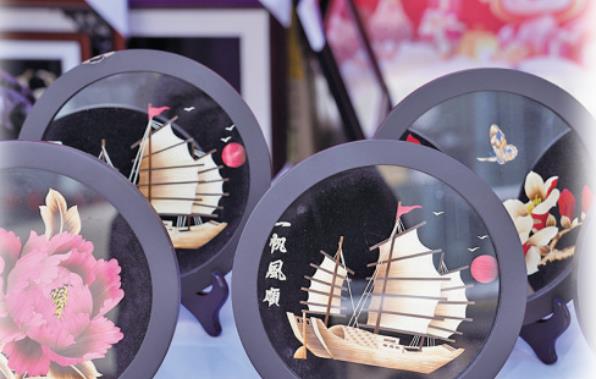 旁邊的麥稈畫展位令人眼前一亮,一幅幅精美的麥稈畫在燈光下熠熠生輝。這些畫作以本地麥稈為原料,經過手工藝人的巧手剪裁、粘貼、上色,變成了栩栩如生的山水、人物、花鳥等各種圖案。