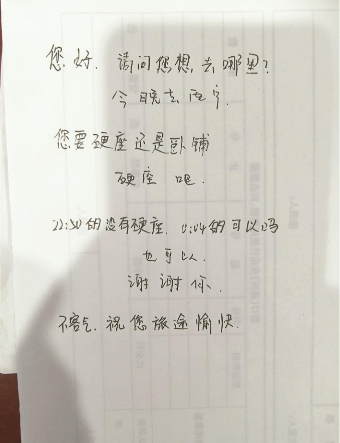 一來一回的文字交流后,山重蘭幫這名旅客很快購買到前往西寧的車票。考慮到乘車時間是0時,為防旅客誤車,山重蘭在乘車提示單上特意注明:“今晚23時30分左右過來坐車。”旅客接過提示單,豎起大拇指并寫下“謝謝你”,山重蘭認真回復:“不客氣,祝您旅途愉快!”