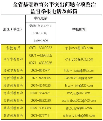 另外,省教育廳公布全省基礎教育公平突出問題專項整治監督舉報電話及郵箱。