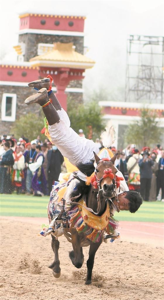 西然吾賽說:“玉樹賽馬會比賽主要包括跑馬賽、走馬賽、牦牛賽等項目。而開幕式現場參賽選手帶來的乘馬射擊、乘馬拾哈達、乘馬倒立等則是觀賞度極高的馬術表演。這些表演項目對選手的騎乘能力有著極高的要求,選手需在奔馬背上穩如磐石,身體懸空時如雄鷹展翅,倒立瞬間似青峰拔地,真的是臺上一分鐘臺下十年功。”