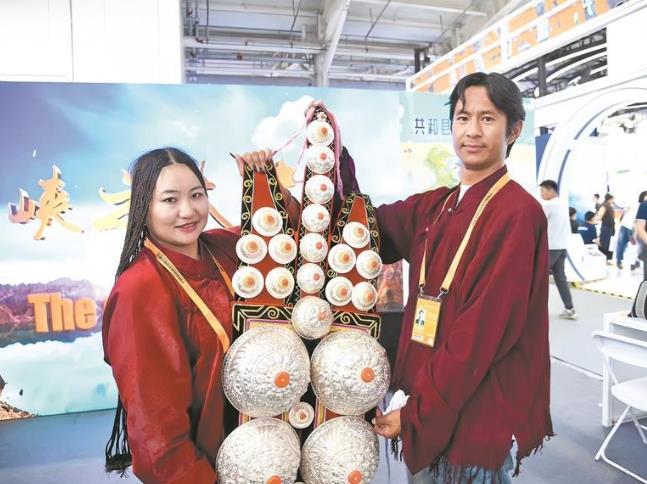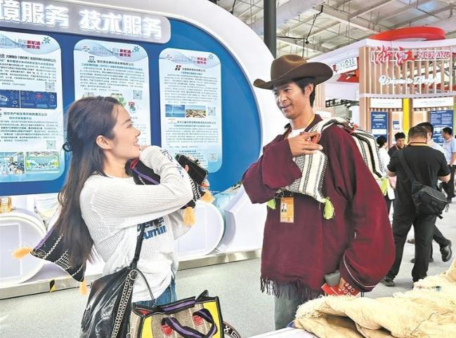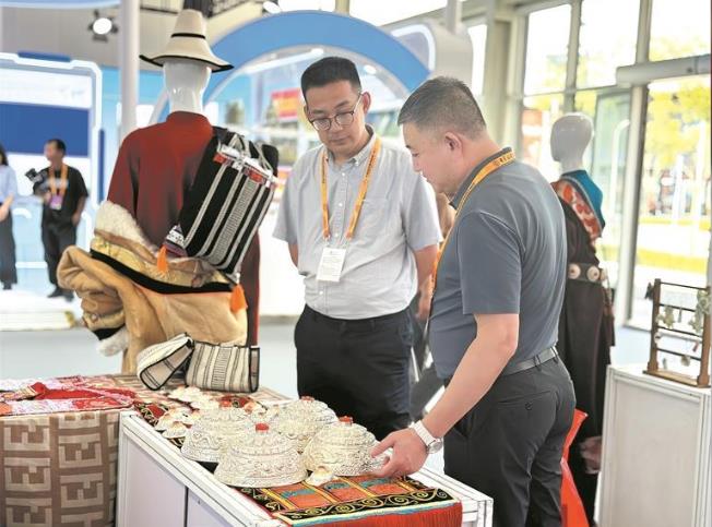 展區內,古樸繁復的藏族飾品、簡約時尚的牦牛毛手提包、色彩艷麗的羊皮襖等極具民族風情的展品錯落擺放,不同風格相互碰撞,盡顯地域特色與創新活力。展臺前,來自全國各地的參展商、嘉賓,有的駐足觀賞,輕輕撫摸飾品上的精細紋飾;有的拿起包袋,細細感受其中的設計巧思,這里成了服貿會上人氣頗高的“打卡點”。