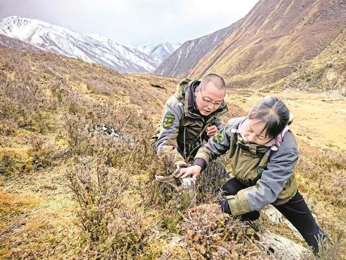 山路崎嶇,我走得氣喘吁吁,生態(tài)管護員們卻步履穩(wěn)健。他們對這里太熟悉了,知道哪個山坡常有巖羊出沒,哪片地方該放置紅外相機。途中,我在草叢中發(fā)現(xiàn)一撮白色毛發(fā),那旭花接過去仔細看了看說:“這是巖羊的毛。”在她眼中,每一處痕跡都在訴說著山林的故事。