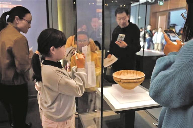 游客觀賞舞蹈紋彩陶盆。圖片由青海省博物館提供