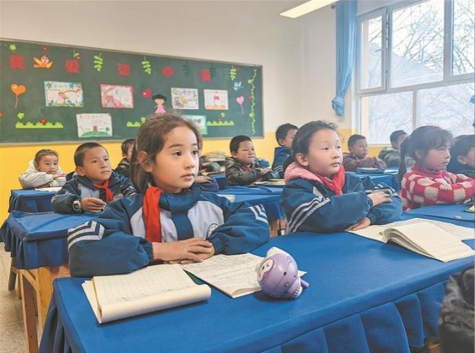 循化縣白莊鎮蘇呼沙學校學生在新教室上課。牛玉嬌 韓麗萍 陳晨 攝