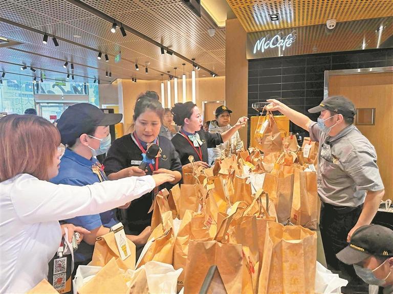 麥當(dāng)勞店內(nèi)工作人員正緊張有序地打包餐品,堆滿桌面的紙袋彰顯出開業(yè)首日的火爆消費(fèi)需求。