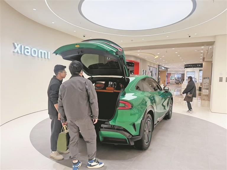 小米門店內(nèi),消費(fèi)者圍繞展車向工作人員咨詢小米汽車相關(guān)信息。