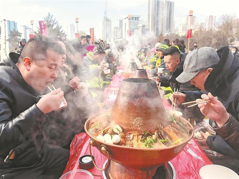 暖流在城市中心同樣汩汩涌動。中心廣場百姓大舞臺前,長桌一字排開,簡單卻隆重。剛出鍋的餃子、熱氣騰騰的暖鍋,氤氳的白霧模糊了彼此的身份標(biāo)簽——環(huán)衛(wèi)工人灰綠相間的工服、保安藏青色的制服、轄區(qū)居民的日常著裝,此刻都圍坐在一起。